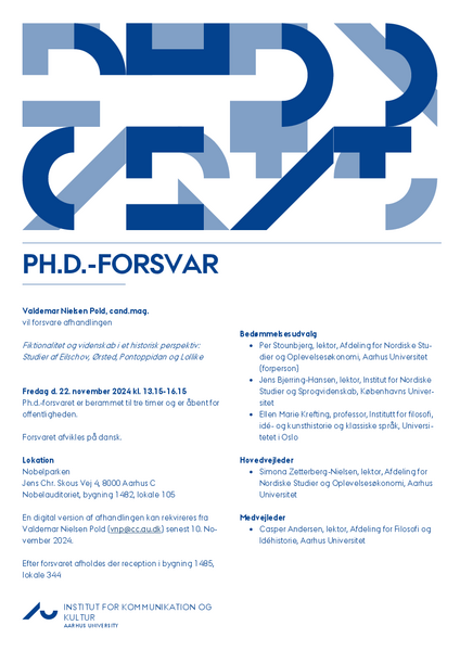 Valdemar Nielsen Pold, cand.mag., vil forsvare sin afhandling "Fiktionalitet og videnskab i et historisk perspektiv: Studier af Eilschov, Ørsted, Pontoppidan og Lollike".