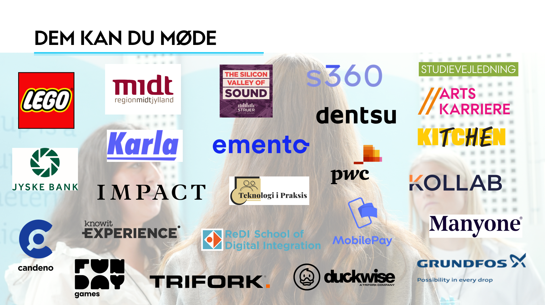 Til arrangementet kunne studerende fra Digital design, Informationsvidenskab, Digitalt liv og Audiodesign møde 22 virksomheder og organisationer, der stod klar til at svare på spørgsmål om karriere, arbejdsopgaver, praktik og overgangen fra studie til arbejdsmarked.