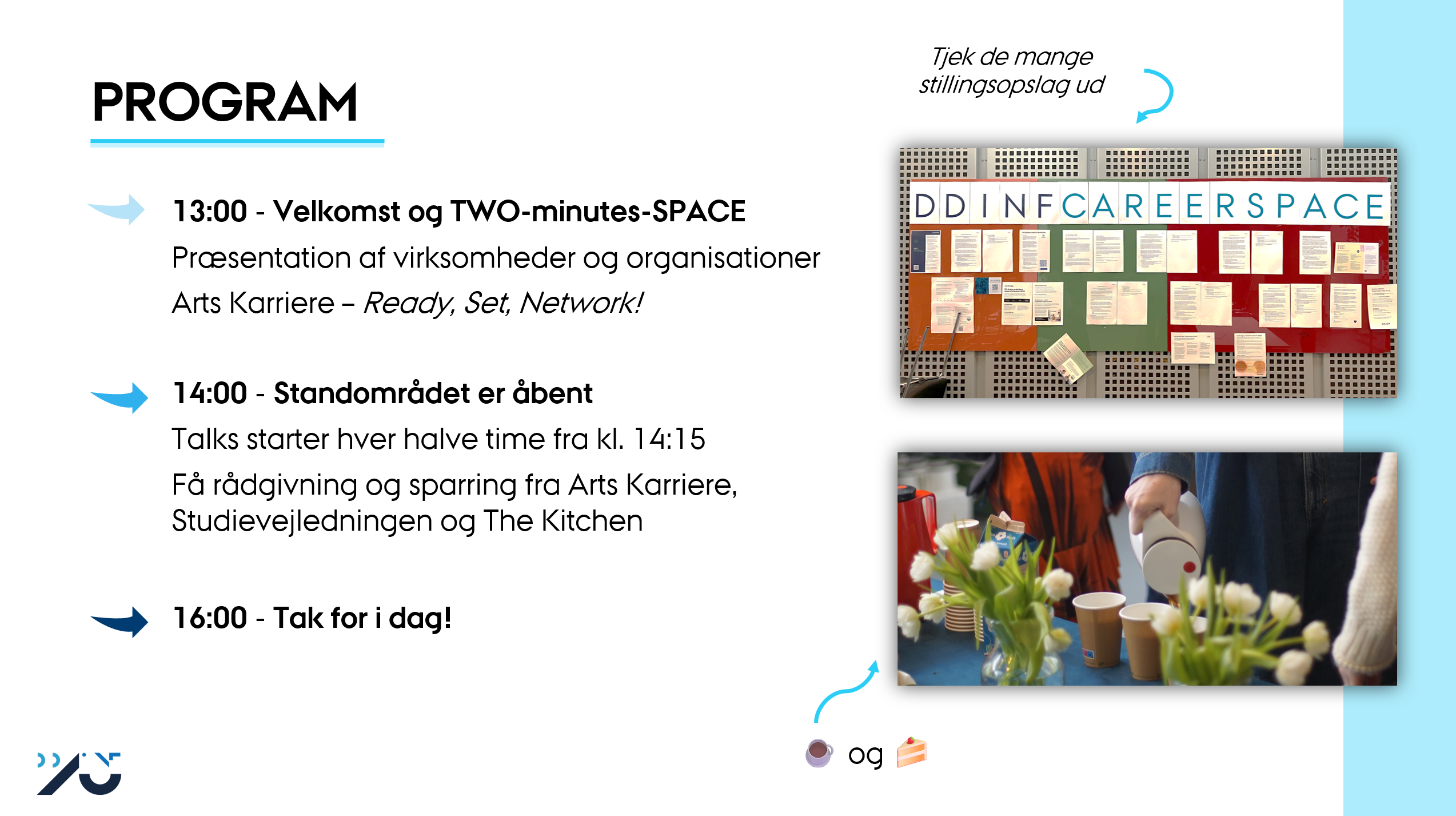 Dagen byder på TWO-minutes-SPACE, hvor dagens program og de deltagende virksomheder præsenteres, hvorefter stand-området åbnes og de studerende kan mødes med virksomhederne i øjenhøjde. Arrangementet styrker samarbejdet mellem de studerende og erhverslivet, hvilket kan føre til muligheder for studiejob, praktik- eller specialesamarbejde. Ydermere kan de studerende undervejs få sparring fra Studievejledning og Arts Karriere.
