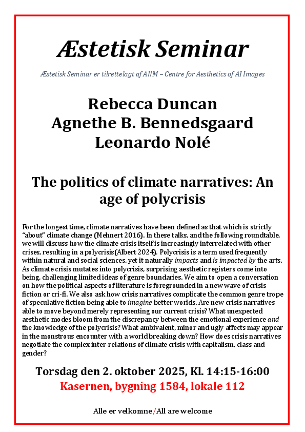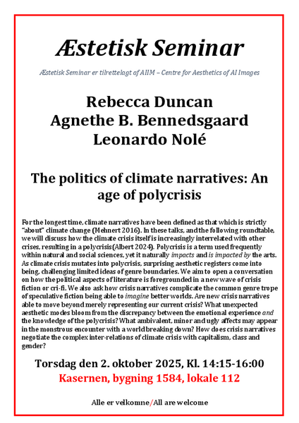Aesthetic seminar - The politics of climate narratives: An age of polycrisis. With Rebecca Duncan, Agnethe B. Bennedsgaard and Leonardo Nolé.