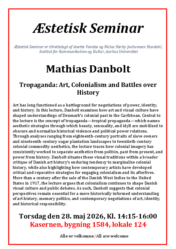 Through analyses ranging from eighteenth-century portraits of slave owners and nineteenth-century sugar plantation landscapes to twentieth-century colonial commodity aesthetics, the lecture traces how colonial imagery has consistently worked to separate aesthetics from politics, past from present, and power from history. Danbolt situates these visual traditions within a broader critique of Danish art history’s enduring tendency to marginalize colonial history, while also highlighting how contemporary artists have developed critical and reparative strategies for engaging colonialism and its afterlives.